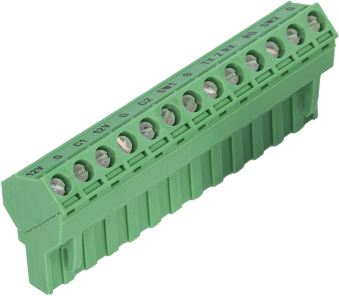 The 36433 connector is the left-most sensor/com connector on the CR350 datalogger. This green, removable connector provides screw terminals for connecting smart sensors on COM2 and connecting SDI-12 sensors on COM1, as well as connecting control wires and a 12 V power supply. The 36433 may be purchased to replace a lost or damaged connector.